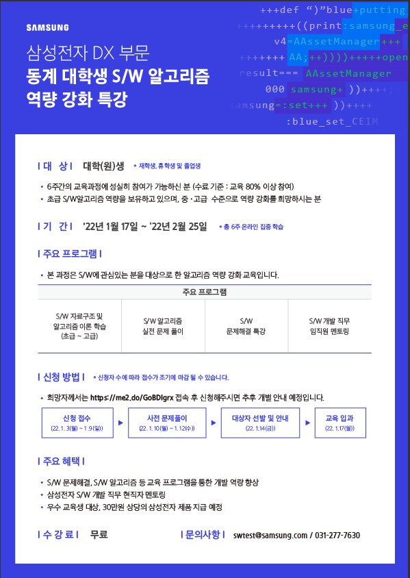 삼성전자 DX부문에서 동계 대학생 S/W 알고리즘 역량 강화 특강 참여자를 모집하고 있습니다.